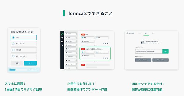 formcatsは昨年9月からβ版を提供していて、今回正式版を開始した。1画面1項目のため、面倒になりがちなフォームへの入力が容易となり、ユーザーは回答する楽しさが体感できるという。アンケートはドラッグ&ドロップと簡単なテキスト入力でできる。用途に応じたテンプレートがあり、アンケート設計にも困らない。