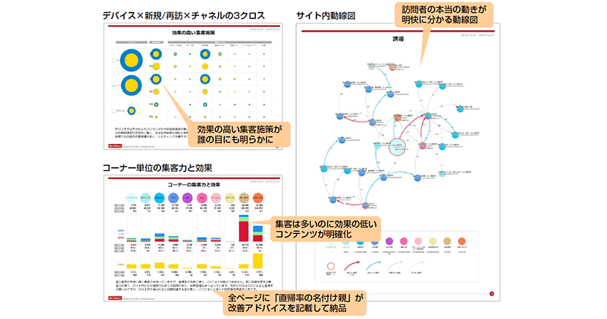 ミルズレポートは、Googleのアクセス解析サービス「Googleアナリティクス」でデータを取ることが難しい内容を標準搭載。サイトの課題が一目で理解できるようなグラフィックを使い、役員会への報告に利用しやすいように8ページに凝縮する。紙出力で製本したリポート、動線図、それらをPDFで格納したDVDで提供する。