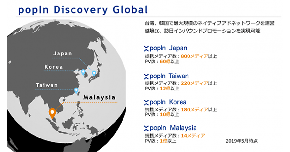 情報通信のpopInは、広告配信管理画面の多言語対応化や、日本円決済を実現などを一括して日本、韓国、台湾へのネイディブアドが配信可能な「popIn Discovery Global」にマレーシアを追加する、と5月20日発表した。
