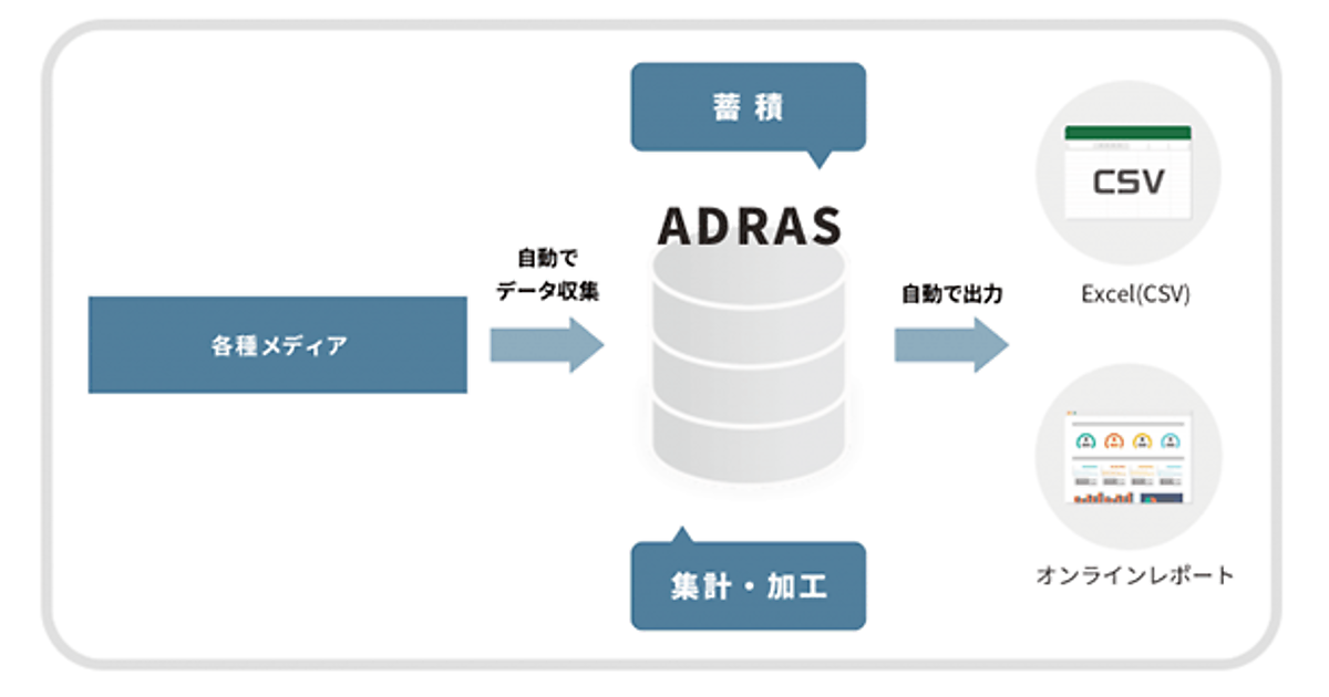 ADRASは広告運用現場で発生する「膨大な量の集計作業に追われる」「データを個人のPC内などで管理しており、滅失する可能性がある」「手作業での集計でミスが発生する」「管理データのファイル容量が重く、閲覧に待ち時間が発生」などの悩みを解決する。