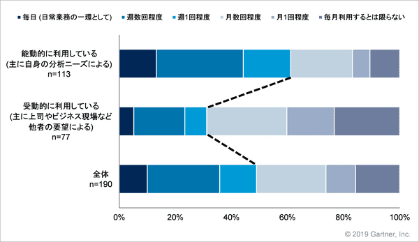 これを「能動的に利用しているユーザー」「受動的に利用しているユーザー」でそれぞれ見ると、やはり能動的に利用しているユーザーのほうが、利用頻度は高い。ただし能動的に利用しているはずのユーザーでも、週1回未満のユーザーが3割近く存在している。