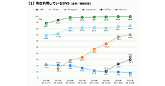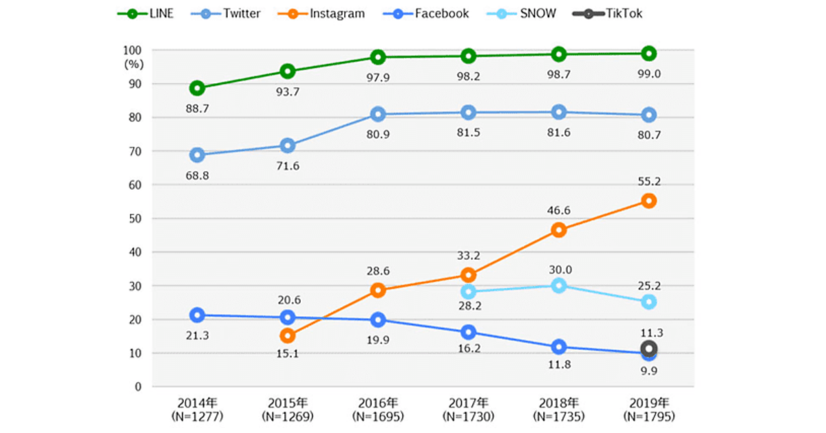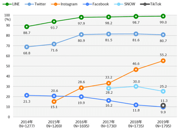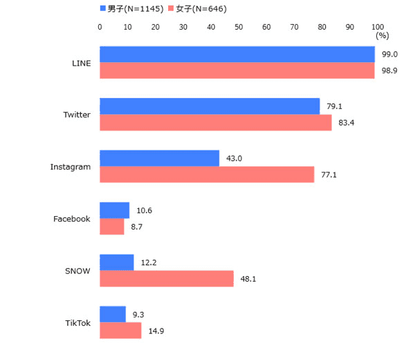 まず主要SNSの利用について聞くと、1位の「LINE」は利用率99.0%とほぼ全員に迫っている。続く「Twitter」は80.7%。3位の「Instagram」55.2%は、4年連続で拡大している。とくに女子では77.1%まで上昇した。同様に「SNOW」「TikTok」も女子人気が強く利用率を押し上げている。「Facebook」は5年間で半減し、9.9%にまで落ち込んだ。