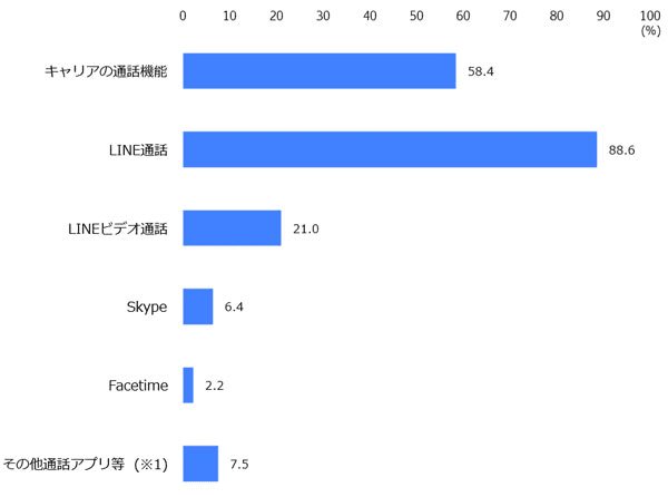 家族や友人との連絡手段としては「LINE」95.9%が断トツの1位。「Twitterのメッセージ」33.3%は前年から8.3ポイントと大きく減少した。一方、ここ数年大きく減少していた「携帯電話/スマートフォンのキャリアメール」は前年から微増し24.8%に回復した。音声通話手段でも「LINE通話」88.6%がトップで、「キャリア通話」58.4%を大きく上回った。LINEの強さが目立つ結果だと言える。