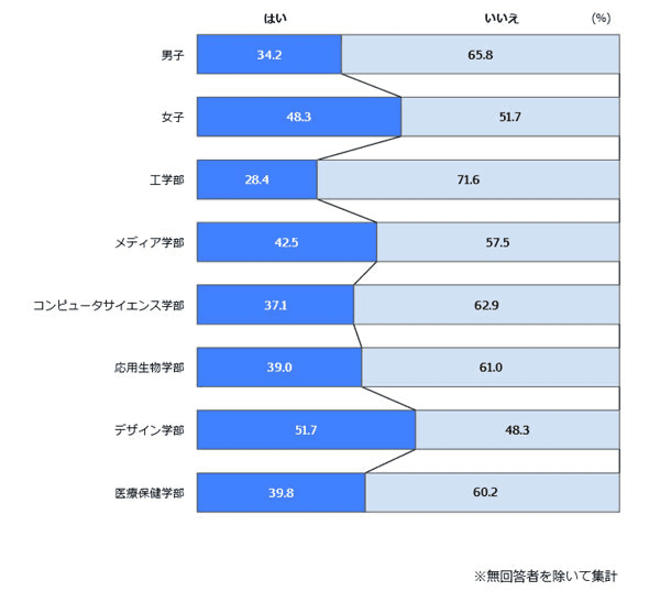 「入学前に新入生同士で、SNSなどで連絡を取り合ったことがあるか」という質問には、39.3%が「ある」と回答。女子(48.3%)が男子(34.2%)を上回り、学部別ではデザイン学部(51.7%)がもっとも高く、工学部(28.4%)がもっとも低かった。