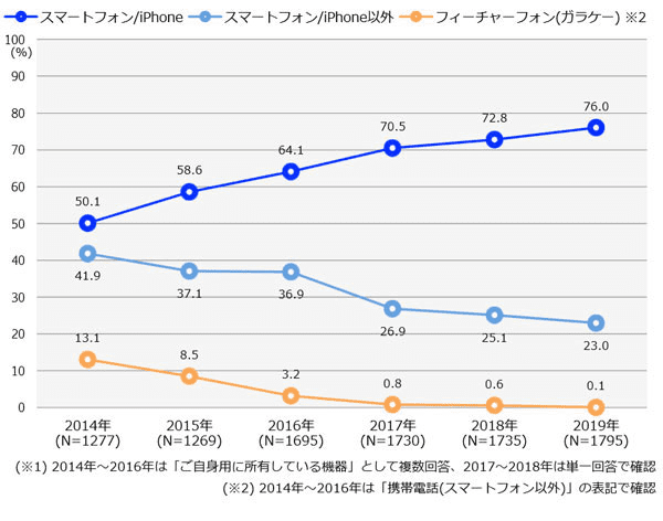 所有している携帯電話の種類では、「iPhone」76.0%が、調査開始以来5年連続の増加。「その他のスマートフォン」23.0%との差が拡大するなど、“若年層のiPhone人気”が顕著となった。