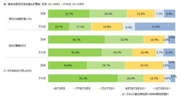 そこで「その処分方法を選んだ理由」を聞くと、「処分が簡単だから」(あてはまる+ややあてはまるの合計、日本75.2%、アメリカ66.5%)は両国で高いが、日本は「得られる金額が高いから」(日本62.0%、アメリカ33.8%)をあげる人が多く、アメリカは「データが消去されて安心だから」(日本60.5%、アメリカ75.1%)をあげる人が多いといった差が出た。下取りの相場やシステムの違いに加え、日本では「持っている・業者に任せるのが安心」、アメリカでは「知り合いに譲る・捨ててしまうのが安心」といった感覚の違いがあるのかもしれない。