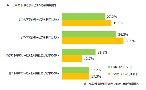 続いて、今後の意向として「次回携帯電話購入の際に、下取りサービス(下取りプログラム)を利用したいか」を聞くと、日本の利用者は「とても下取りサービスを利用したい」27.2%、「やや下取りサービスを利用したい」34.3%で、計61.6%が利用意向を示した。アメリカの利用者に聞いたところ、「とても下取りサービスを利用したい」31.1%、「やや下取りサービスを利用したい」38.9%、計70.0%でややアメリカが上回る。