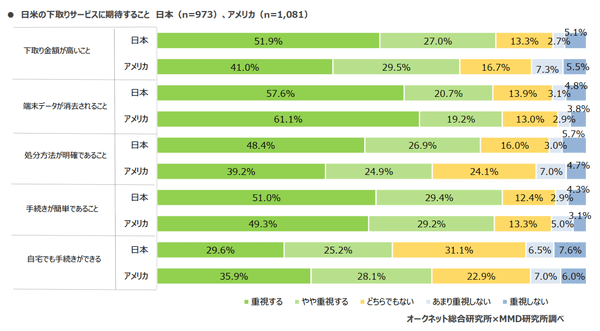 「下取りサービスに期待すること」を聞くと、日本の回答上位は「端末データが消去されること」57.6%、「下取り金額が高いこと」51.9%、「手続きが簡単であること」51.0%の順。一方アメリカの回答上位は「端末データが消去されること」61.1%、「手続きが簡単であること」49.3%、「下取り金額が高いこと」41.0%の順。単純な合計で見ると、両国1位はやはり「端末データが消去されること」、ついで「手続きが簡単であること」と考えられる。