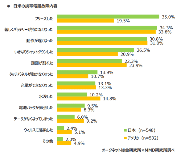 「携帯電話で故障や不具合が発生した経験」については、日本の56.3%、アメリカの49.2%が「ある」と回答。故障内容では、日本が「フリーズした」35.0%、「著しくバッテリーが持たなくなった」34.3%、「動作が遅くなった」30.8%が上位だった。アメリカは、「著しくバッテリーが持たなくなった」33.8%、「動作が遅くなった」31.0%、「画面が割れた」23.9%の順。背景には、普及している機種のメーカー、気象条件、電気・電波事情の差があると考えられる。