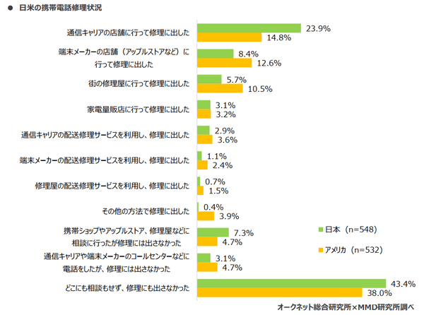 故障や不具合を経験したことがあると回答した人(日本548人、アメリカ532人)に「修理」について聞いたところ、日米ともに「どこにも相談もせず、修理にも出さなかった」という回答が最多。その理由を聞くと、日本は「修理に出すのが面倒だったから」35.6%、「修理しなくても使えそうだったから」34.6%、「修理費用が高額になりそうだったから」31.2%が上位だったが、アメリカは「修理しなくても使えそうだったから」50.4%、「修理費用が高額になりそうだったから」38.5%、「修理に出すのが面倒だったから」31.3%の順だった。