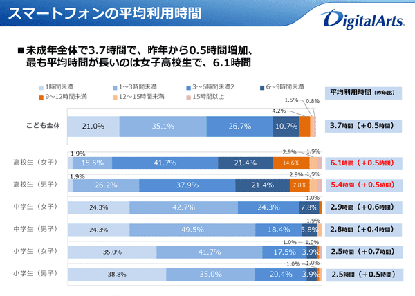 平均利用時間も伸長しており、前回から0.5時間増加し3.7時間。小学生が2.5時間(前回から0.6時間増加)、中学生が2.8時間(0.4時間増加)、高校生が5.7時間(0.1時間増加)。最も平均時間が長いのは高校生女子で6.1時間に達している。