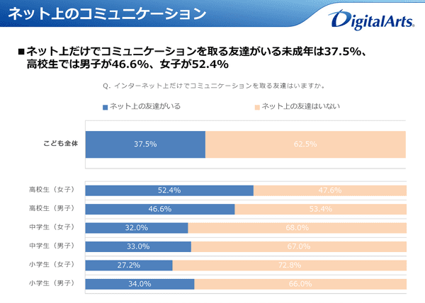 ここからは、ネット上のコミュニケーションに対する危機意識を探る質問を行った。まず「ネット上のみでコミュニケーションを取る友達(ネット上の友達、ネッ友)」の有無を聞くと、「いる」としたのは小・中・高校生全体の37.5%。年齢が上がるほど比率は上がり、高校生女子で52.4%、高校生男子で46.6%に達する。