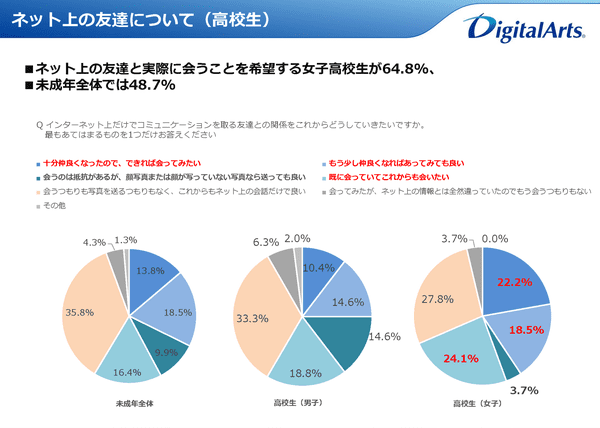 「ネット上の友達との接し方」について聞くと、全体では「十分仲良くなったので、できれば会ってみたい」13.8%、「もう少し仲良くなれば会ってみても良い」18.5%、「会うのは抵抗があるが、顔写真または顔が写っていない写真なら送っても良い」9.9%、「既に会っていてこれからも会いたい」16.4%などだった。総じて、ネッ友に会うことのハードルは低い。