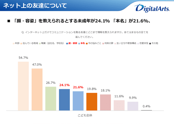 また「ネッ友にどこまで情報を教えられるか」という質問でも、「年齢」54.7%、「住んでいる地域」47.0%のほか、「職業(会社名・学校名)」26.7%、「顔、容姿」24.1%、「本名」21.6%などが2割を超えるなど、危機意識の低さが浮き彫りになった。