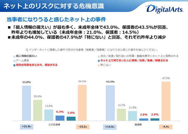 一方で「自分が当事者(被害者/加害者)になりうると感じた事件を選んでください」という設問では、「個人情報の漏えい」が前回の22.0%から大きく増加し小・中・高校生の43.0%となっている。「ネット上で知り合った人に誘拐/拉致/乱暴/殺害される」6.3%、「自分の写真を送らされ、脅迫される」5.0%も存在する。