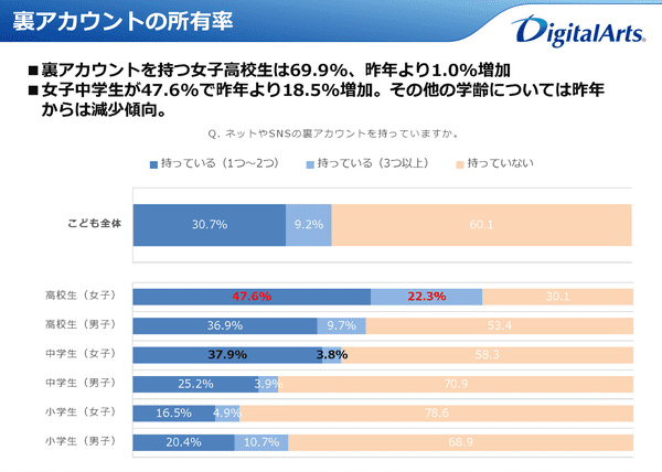 「ネットやSNSの裏アカウント」の有無を聞くと、小・中・高校生全体の30.7%が裏アカウントを所有していた。女子高校生では69.9%、女子中学生でも47.6%が裏アカウントを利用していた。特に女子中学生は昨年から18.5%と大きく伸びている。