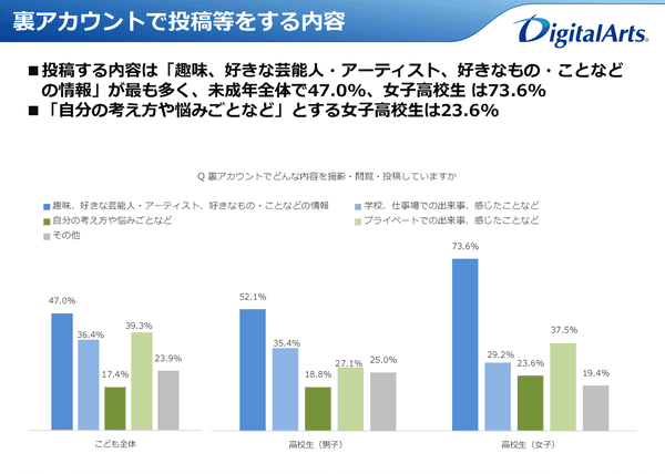 裏アカで投稿する内容は、「趣味、好きな芸能人・アーティスト、好きなもの・こと」が未成年全体でもっとも多く、47.0%だった。