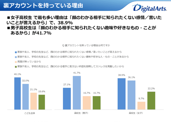 小・中・高校生の“裏アカ”所有率は3割超、しかし危機意識が低くトラブルは「他人事」【デジタルアーツ調べ】
