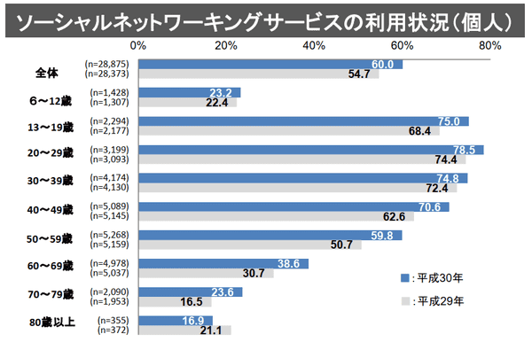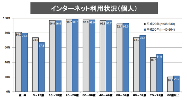まず、インターネットの利用状況(個人)は全体で79.8%。年代別では20歳代がもっとも高く98.7%に達する。