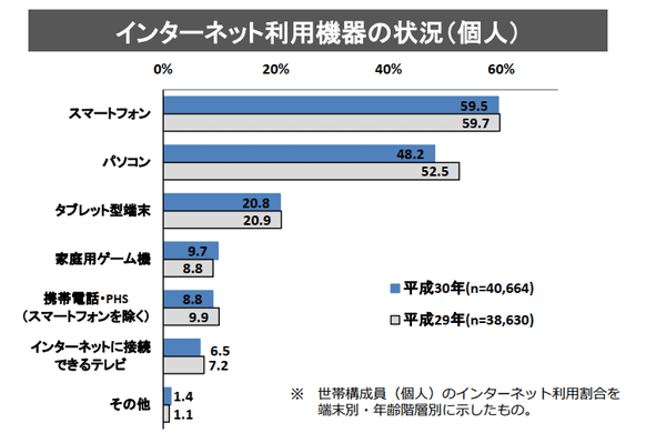 インターネット利用機器のトップは「スマートフォン」59.5%だが昨年の59.7%より微減。ただし2位の「パソコン」48.2%は前年52.5%よりさらに大きく下がっている。