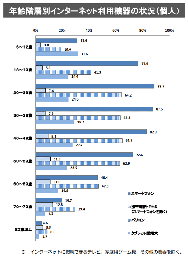 ほぼ8割がネット利用、中心機器はスマートフォンだが6~12歳はタブレット