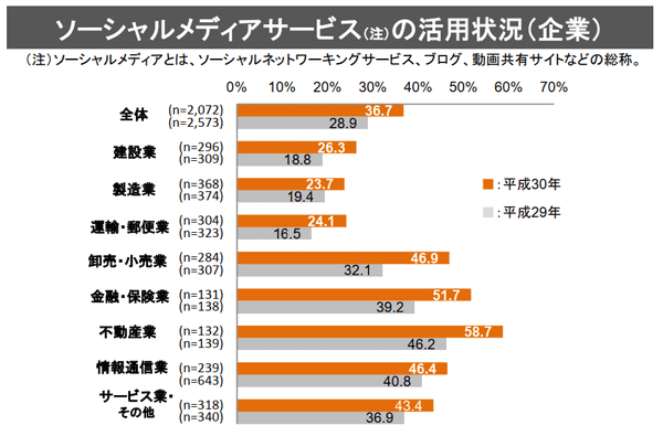 「ソーシャルネットワーキングサービス」(SNS、ブログ、動画共有サービスなど)については、個人も企業も利用割合が上昇していた。個人は前年54.7%から60.0%と5.3ポイントの上昇だが、企業は前年28.9%から36.7%と7.8ポイントの上昇となっている。業種別では、卸売・小売業(32.1%→46.9%)、金融・保険業(39.2%→51.7%)、不動産業(46.2%→58.7%)などの伸びが大きい。