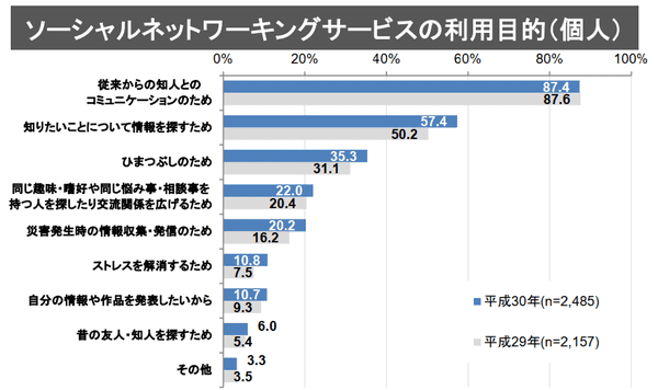 利用目的・用途では、個人は「知りたいことについて情報を探すため」「ひまつぶしのため」「同じ趣味・嗜好や同じ悩み事・相談事を持つ人を探したり交流関係を広げるため」などの割合が、企業は「会社案内、人材募集」「申し込みや届出の受付」などの割合が上昇した。