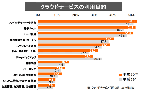 「クラウドサービス」を利用している企業は58.7%と、毎年徐々に拡大している。利用目的については、「ファイル保管・データ共有」53.1%、「電子メール」52.2%、「サーバ利用」51.0%が上位。「営業支援」16.7%、「生産管理・物流管理・店舗管理等」9.0%などは少数派だ。