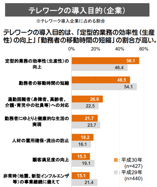「テレワーク」について、導入しているまたは具体的な導入予定がある企業は26.3%。テレワークの導入目的(企業)では「定型的業務の効率性(生産性)の向上」56.1%、「勤務者の移動時間の短縮」48.5%が上位だった。