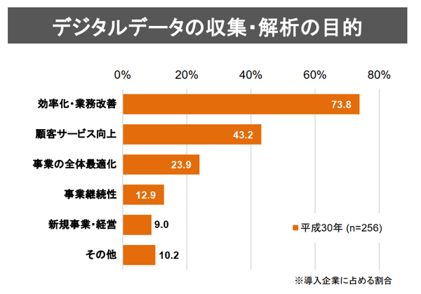 「AI・IoT等によるデジタルデータの収集・利活用」について、導入しているまたは導入予定があるとした企業は2割超。目的においては「効率化・業務改善」73.8%が断トツの1位だった。