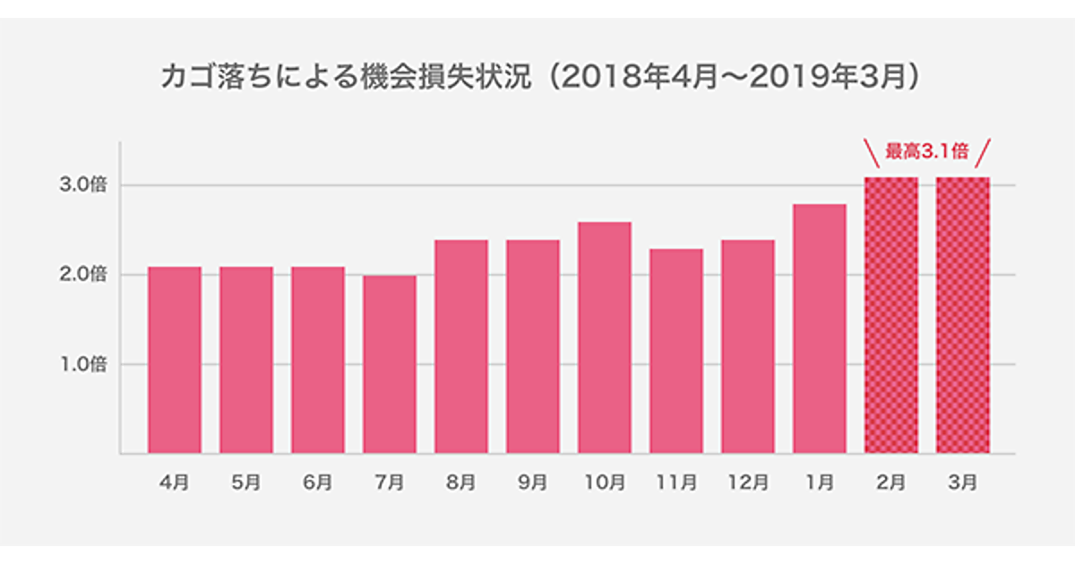 また、カゴ落ちによる機会損失額を調査したところ、平均で売上の約2.5倍にのぼることがわかった。4月~7月までは約2.1倍前後となっていたが、8月~11月、1月~3月頃にかけて差が広がった。特に2月と3月では広がりが増し、最大で売上の約3.1倍も機会損失していることがわかった。
