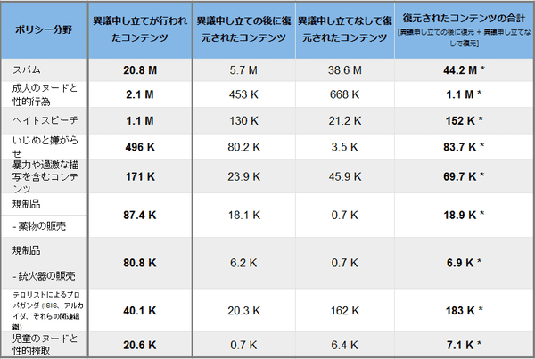 単純数では、「スパム」に次いで「成人のヌードと性的行為」の復元数が多い。また異議申し立て数との対比で算出すると、「ヘイトスピーチ」11.8%、「規制品(銃火器の販売)」7.7%、「児童のヌードと性的搾取」3.4%で、これらの分野の復元率は低い。なお、2018年第4四半期に異議申し立てが行われたコンテンツが2019年第1四半期に復元された可能性がある点には留意する必要がある。