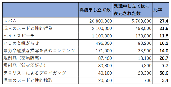 また、こうした対処における「異議申し立て」と「誤判断の修正」に関するデータも、今回初めて公開された。たとえば、「スパム」と見なされたコンテンツにおいて、異議申し立てが行われたのは、2,080万件。そのうち誤判断だったとして復元されたのは570万件だった。なお、異議申し立て無しで復元されたコンテンツも3,860万件あり、合計4,420万件が「スパム」分野においては復元されている。