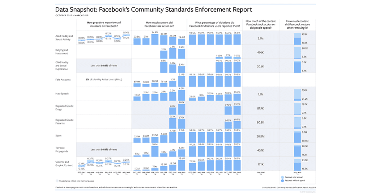 主要な指標の1つとして「表示頻度(プレヴァレンス)」があげられているが、2019年第1四半期におけるFacebook利用者のコンテンツ閲覧では、10,000回のうち、11~14回が「成人のヌードと性的行為」ポリシー違反コンテンツ、25回が「暴力や過激な描写を含むコンテンツ」ポリシー違反コンテンツを含むと推定されている。