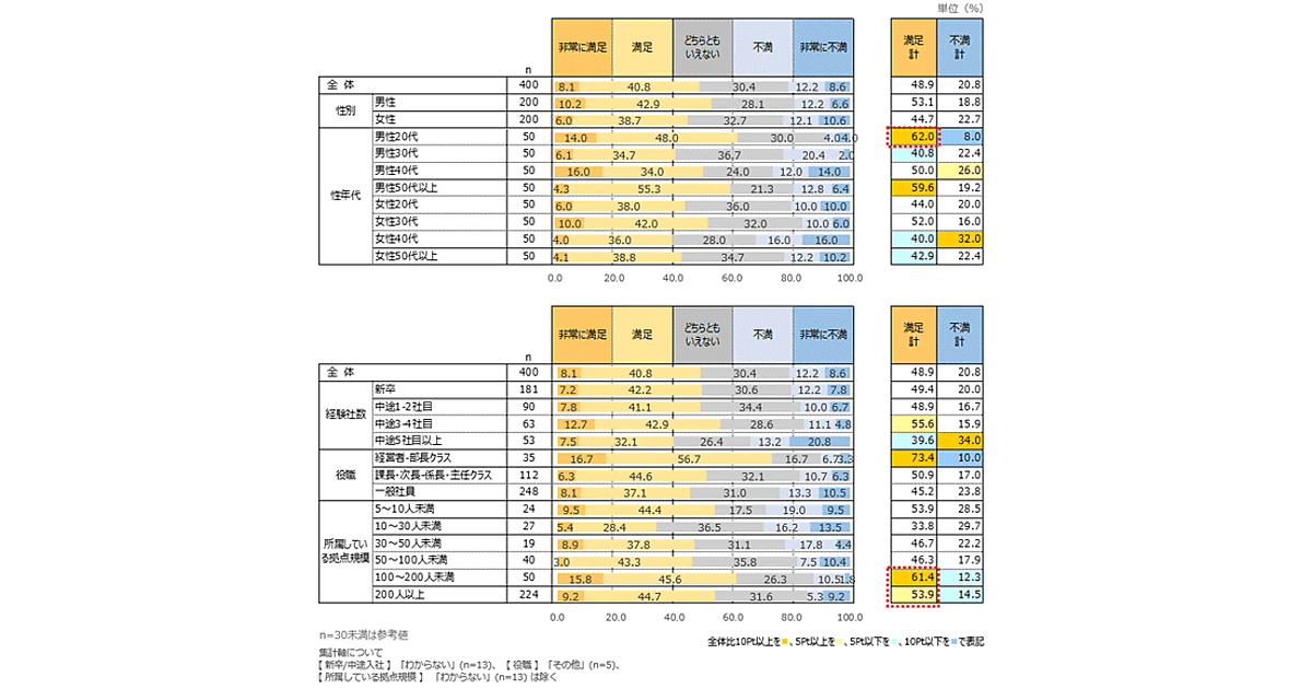 次に、「上司とのコミュニケーション」について焦点を当てると、全体で「非常に満足」「満足」の合計は48.9%。性別では、「同僚とのコミュニケーション」の満足度は、男性のほうが高かったが、「上司とのコミュニケーション」の満足度でも、男性のほうが高い。