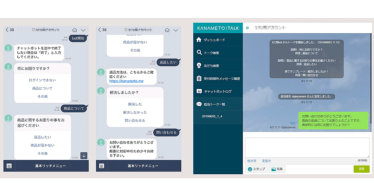 KANAMETOは、LINEユーザーとの1対1のチャットコミュニケーションができるほか、アンケート機能があり、属性に合わせたセグメント配信も可能。料金は月額7万円(税別)。LINEによる問い合わせ窓口の設置が増加する中、ユーザー自らが容易に解決できる案件をチャットボットにすることで、有人対応件数の削減につなげられる。