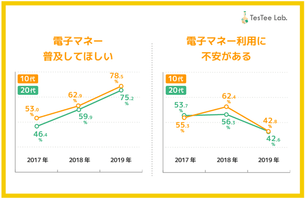 最後に対象者全員を対象に、「今後電子マネーがさらに普及してほしいと思うか」を聞くと、「普及してほしいと思う」は、10代78.5%、20代75.2%となり、2017年、2018年調査と比較して、着実に上昇している。「電子マネー利用について不安があるか」についても、2018年には上昇したが、今回調査で大きく減少している。