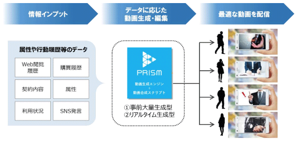 クリエ・ジャパンは、顧客に応じて動画を最適化するパーソナライズド動画ソリューション「PRISM」を提供し、動画を活用した1対1のマーケティングを支援している。PRISMは、ユーザー情報に基づいてサーバー上で自由に動画を組み合わせて合成することで、ユーザーの特性に合わせた動画が大量・リアルタイムに生成できる。