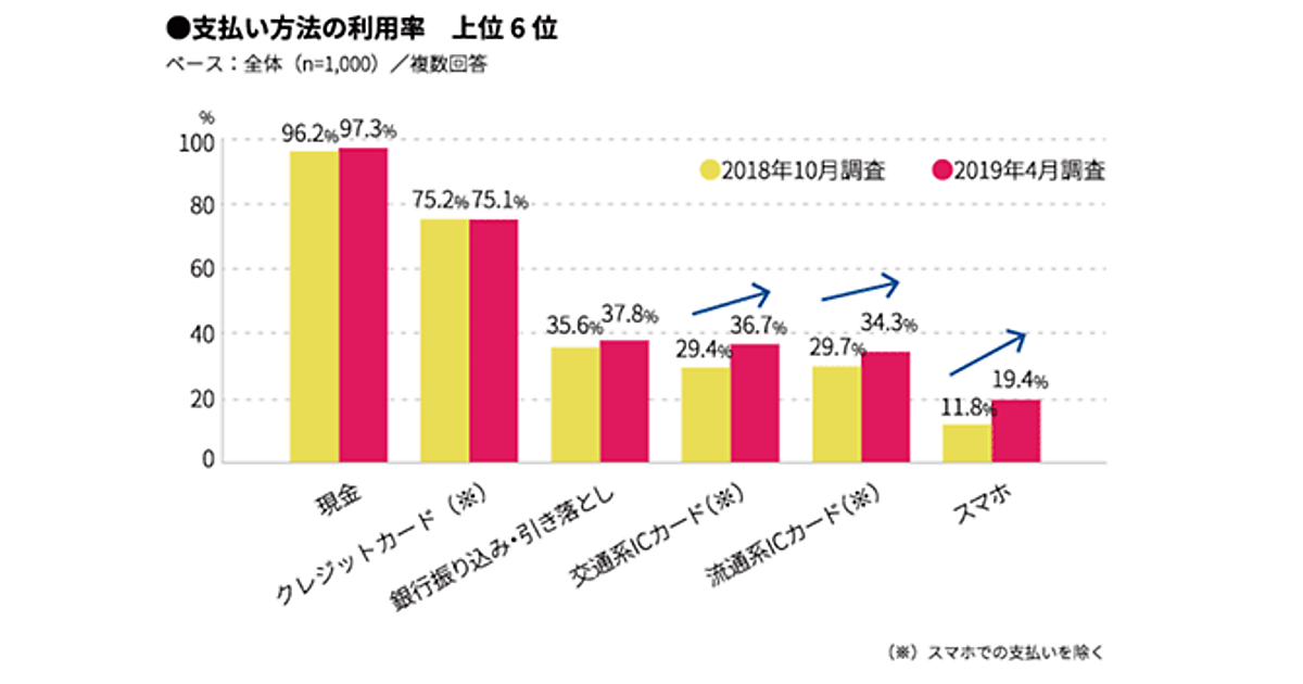 普段どのような方法で支払いをしているのか尋ね、2018年10月に実施した調査結果と比較した。