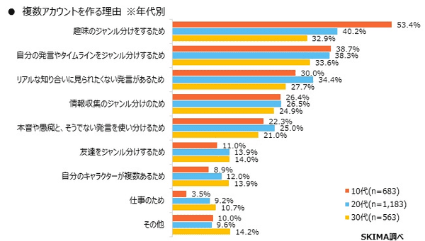 そこで「複数のアカウントを持つ理由」を聞くと、10代は「趣味のジャンル分け」、20代は「知り合いに見られたくない発言がある」「本音や愚痴と使い分け」、30代は「自分のキャラクターが複数ある」が他年代に比べ突出していた。