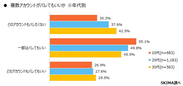 「リアルな知り合いに見られたくない発言がある」という回答が全体的に多く、「自分のキャラクターが複数ある」という回答が、上の年代ほど増えている傾向も見られる。複数アカウントの存在を「絶対にバレたくない」と回答したのも、30代が最多だった。