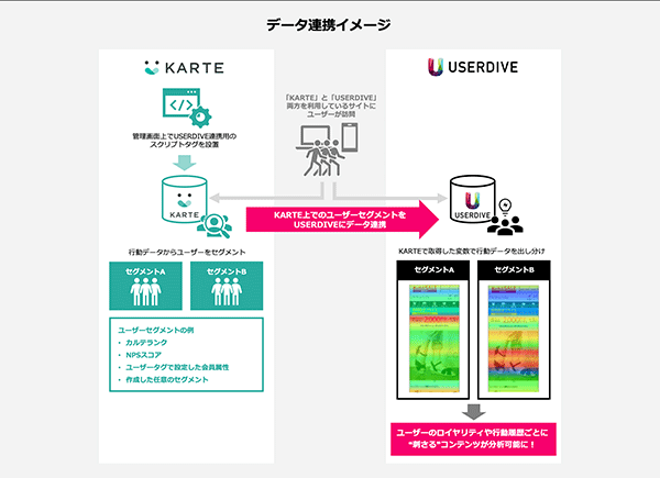 両ツールの連携で(1)KARTEで管理する顧客セグメントデータを分析して態度変容を生むページを把握(2)ページ内のユーザー行動をUSERDIVEで可視化・分析して態度変容につながるコンテンツを把握(3)コンテンツで態度変容が見込まれる顧客群にKARTEでコミュニケーションを最適化--の流れでサイトの改善を支援する。
