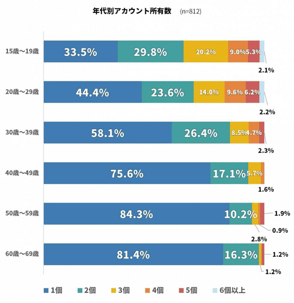 アカウント所有数を年代別に見てみると、複数アカウントを使用しているのは比較的若い世代が多い。10代・20代では、複数アカウントの所持者が半数を超える。