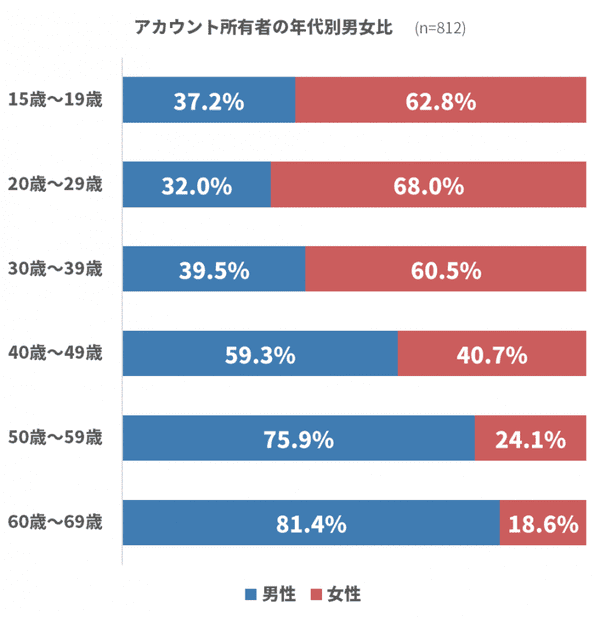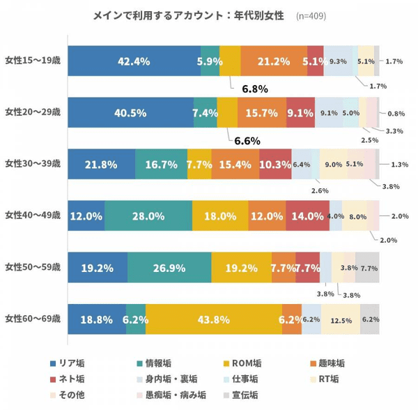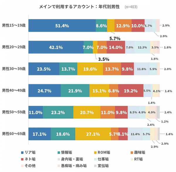 性年代別でも利用傾向に違い、年代が上がるほどリア垢利用が減少