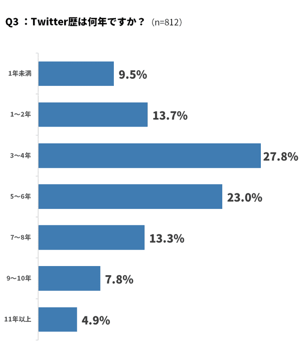 なお「Twitterの利用年数」を聞くと、「3~4年」27.8%、次いで「5~6年」23.0%の順となった。TwitterのUIは2008年4月頃に日本語化されており、「11年以上」4.9%はその頃から使用していたことになるとのこと(サービス開始自体は2006年7月)。