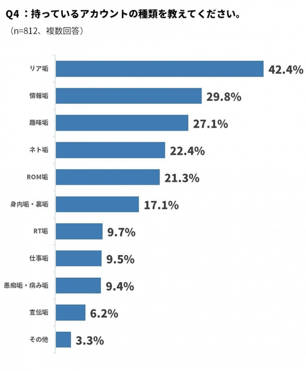 もっとも多かったのは、順当に「リア垢」42.4%だった。以下、「情報垢」29.8%、「趣味垢」27.1%が続く。一方、匿名での交流にのみ利用される「ネト垢」は、22.4%に留まっている。