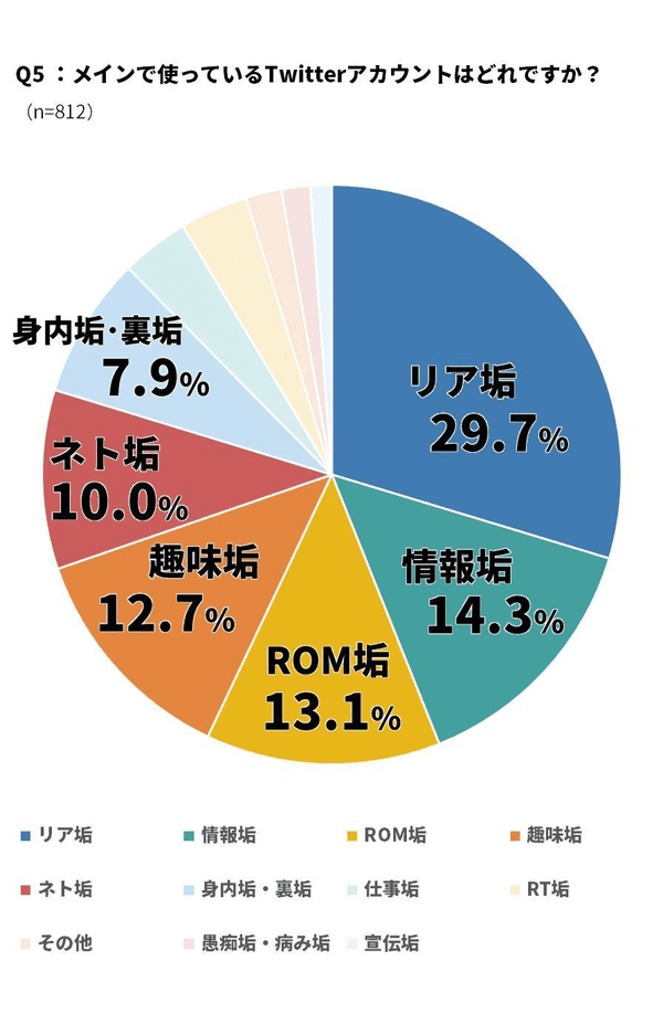 「所有しているアカウントのうち、メインで使っている種類はどれか?」を聞くと、「リア垢」29.7%、「情報垢」14.3%、「ROM垢」13.1%の順となった。リア垢を持っていても、それだけを使うのでなく、目的に応じて複数アカウントを使い分けている実態が垣間見える。