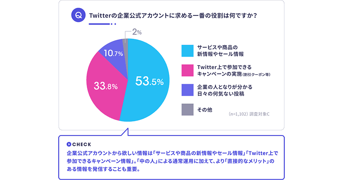 さらに「Twitterで企業公式アカウントからもっとも欲しい情報(求める一番の役割)」を聞くと、「サービスや商品の新情報やセール情報」53.5%がやはり1位。「Twitter上で参加できるキャンペーンの情報(割引クーポン等)」33.8%も多い。「企業の人となりが分かる日々の何気ない投稿」10.7%は少数派だ。