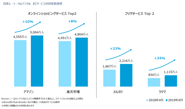 2019年4月時点のオンラインショッピングサービスの利用者数は、「Amazon」が5,004万人(昨年同月比10%増)と5,000万人台を突破。続く楽天市場も4,804万人(同増8%)と肉薄している。一方フリマサービスは、「メルカリ」2,216万人(同33%増)、「ラクマ」1,115万人(同34%増)と、さらに大きく利用者数を伸ばしている。