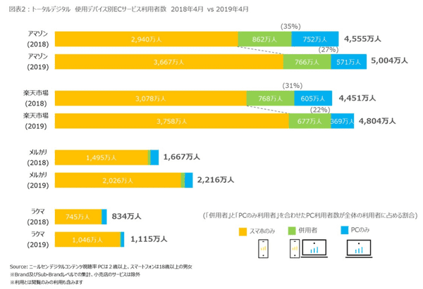 使用デバイス別でみると、「スマートフォンのみで利用している人」が、いずれのサービスでも大きく伸長。「Amazon」「楽天」は、2018年4月時点でPC利用者が約3割(Amazon:35%、楽天:37%)いたが、2019年に入りそれぞれ、27%、22%まで減少した。数年前には「EC利用はやはりPCからが定番」といった言説もあったが、もはや主戦場はスマートフォンに完全移行している。